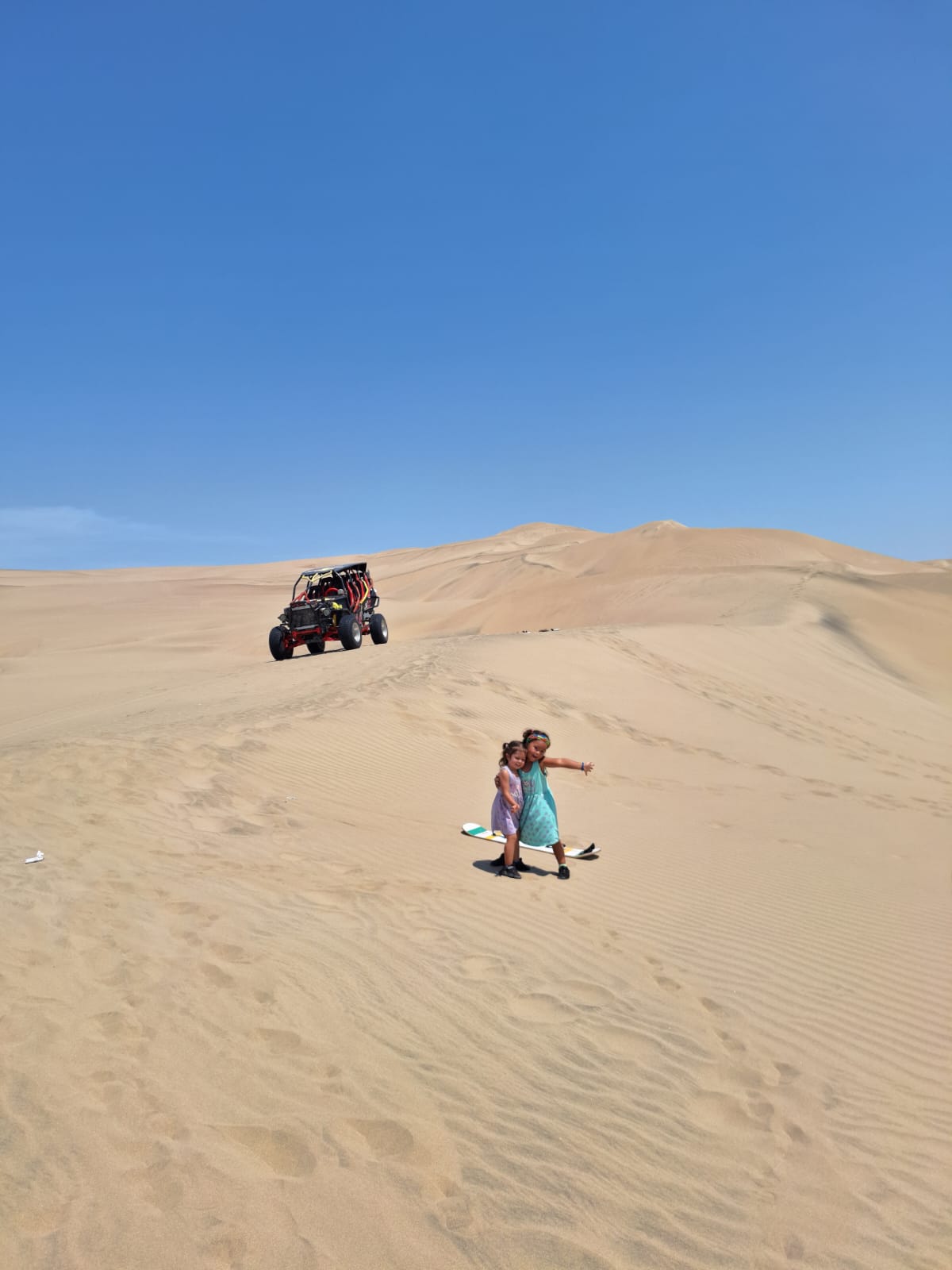 - La primera parada es en el mirador de la ciudad de Ica. Luego nos dirigimos a realizar el deporte de sandboarding en dunas adecuadas para los niños. Empezaremos con una duna pequeña, luego una grande, y luego una mediana, aumentando gradualmente el nivel hasta que los niños se sientan confiados para lanzarse. El chofer será su guía e instructor en cómo realizar el deporte y se debe seguir sus instrucciones en todo momento.